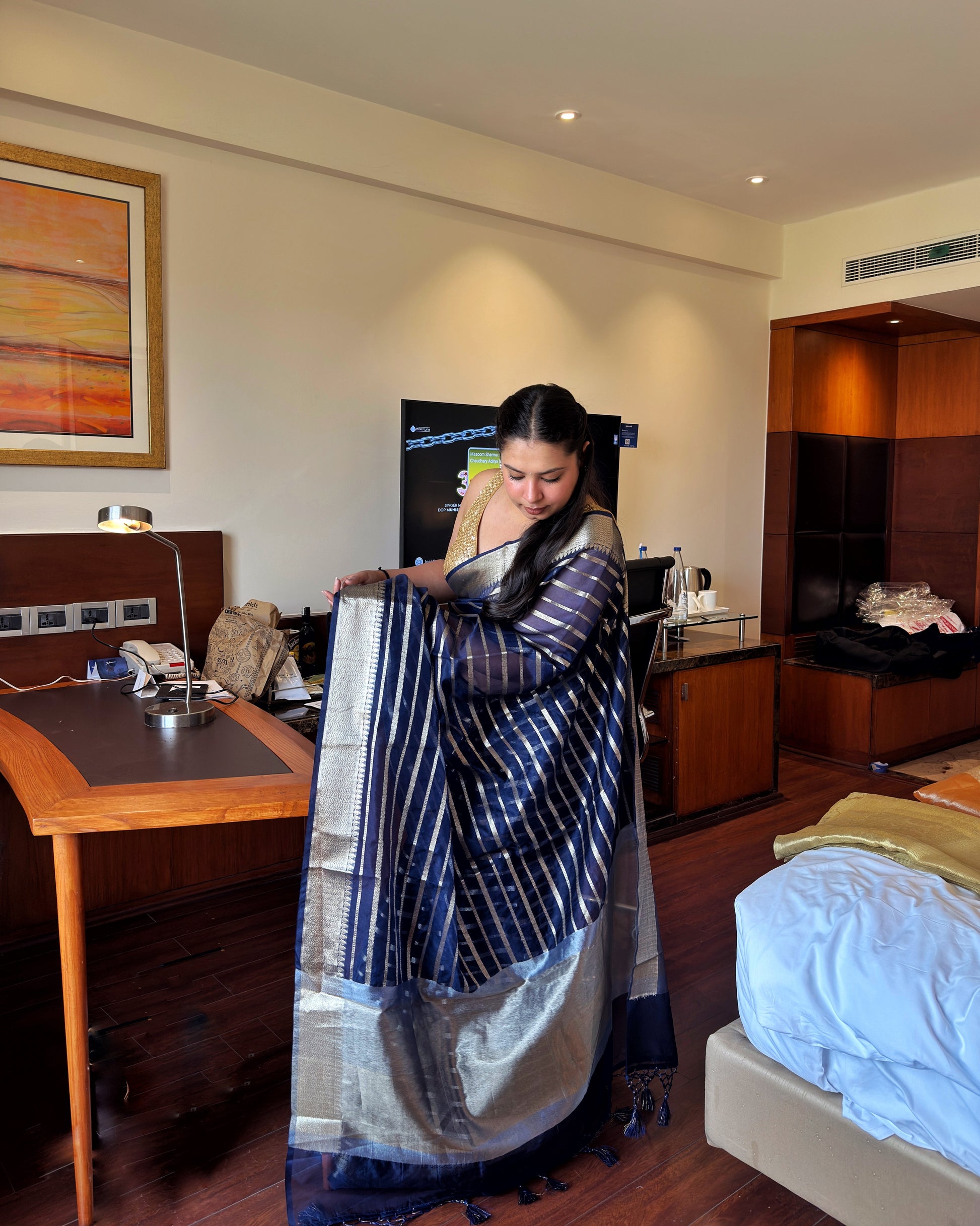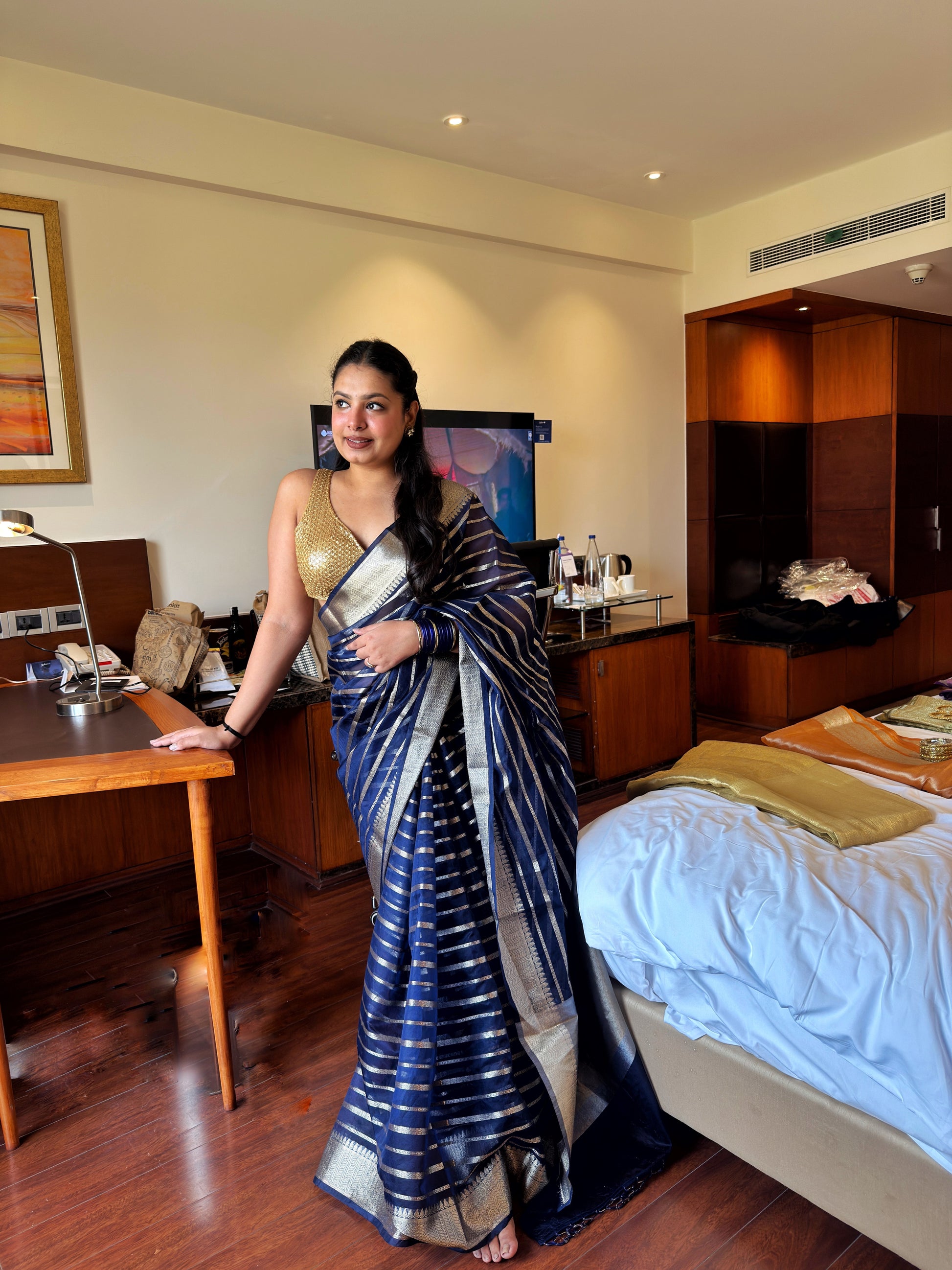 The deep navy tissue silk sets the stage, while shimmering golden diagonal stripes add movement and drama.