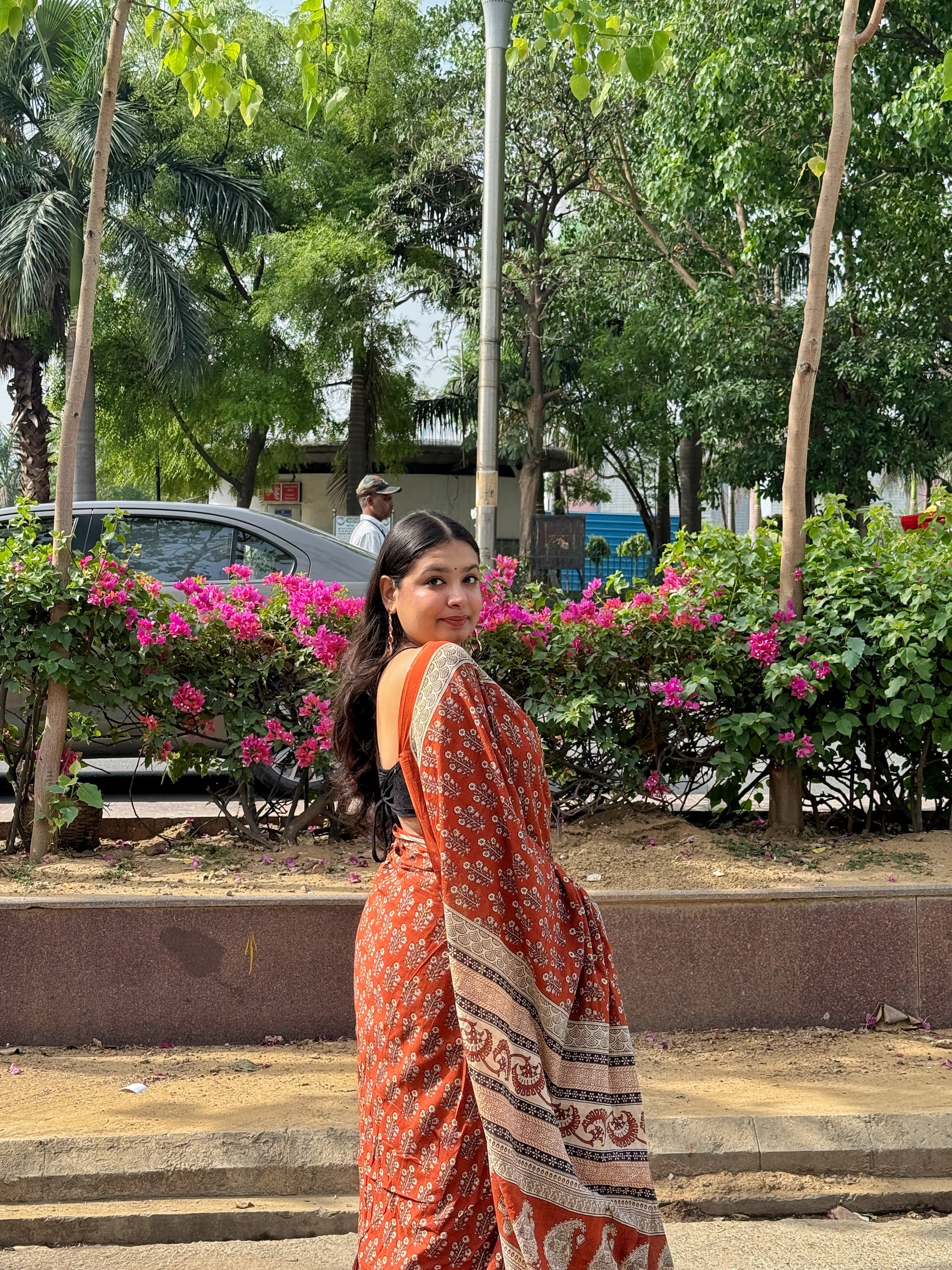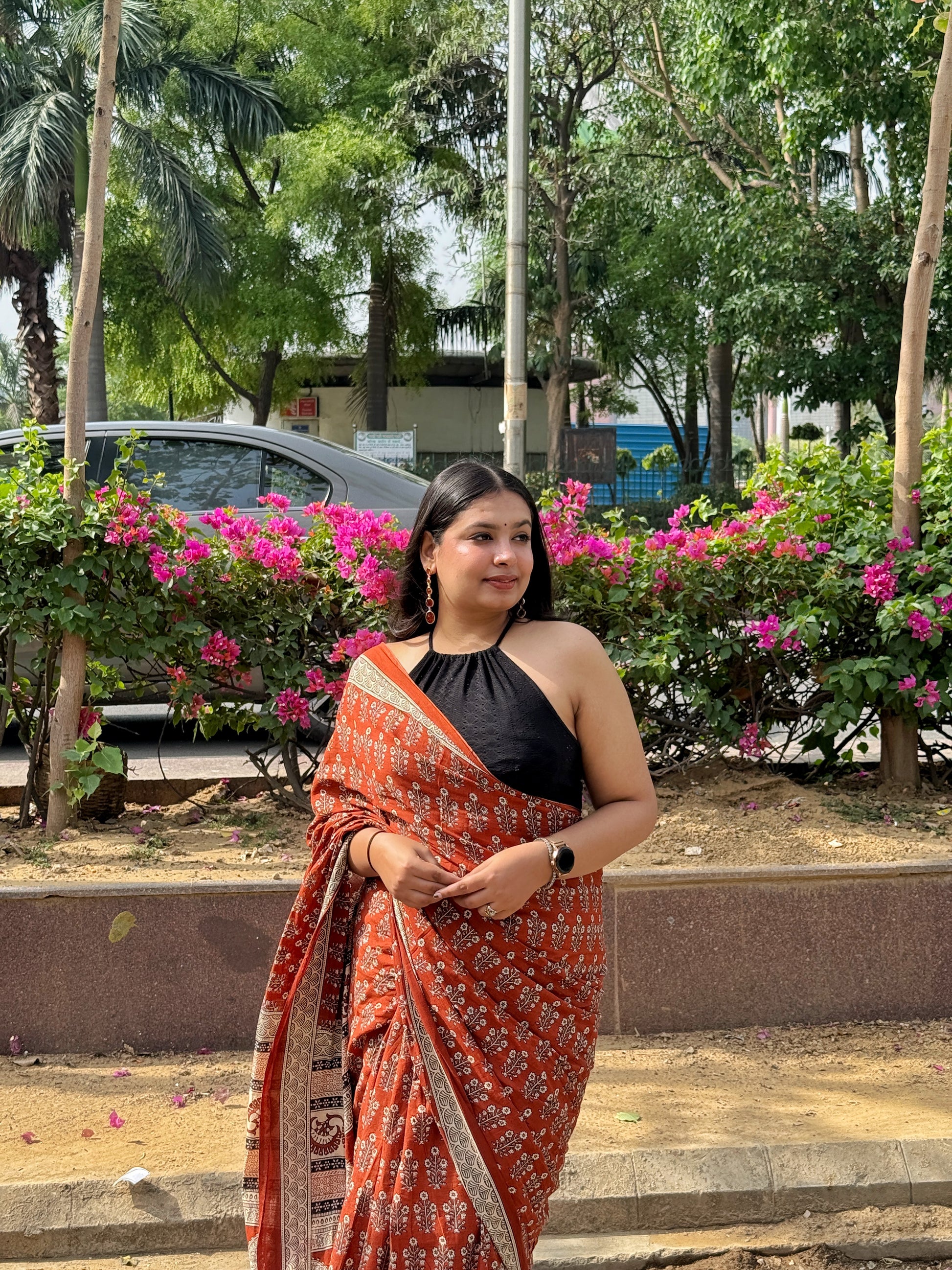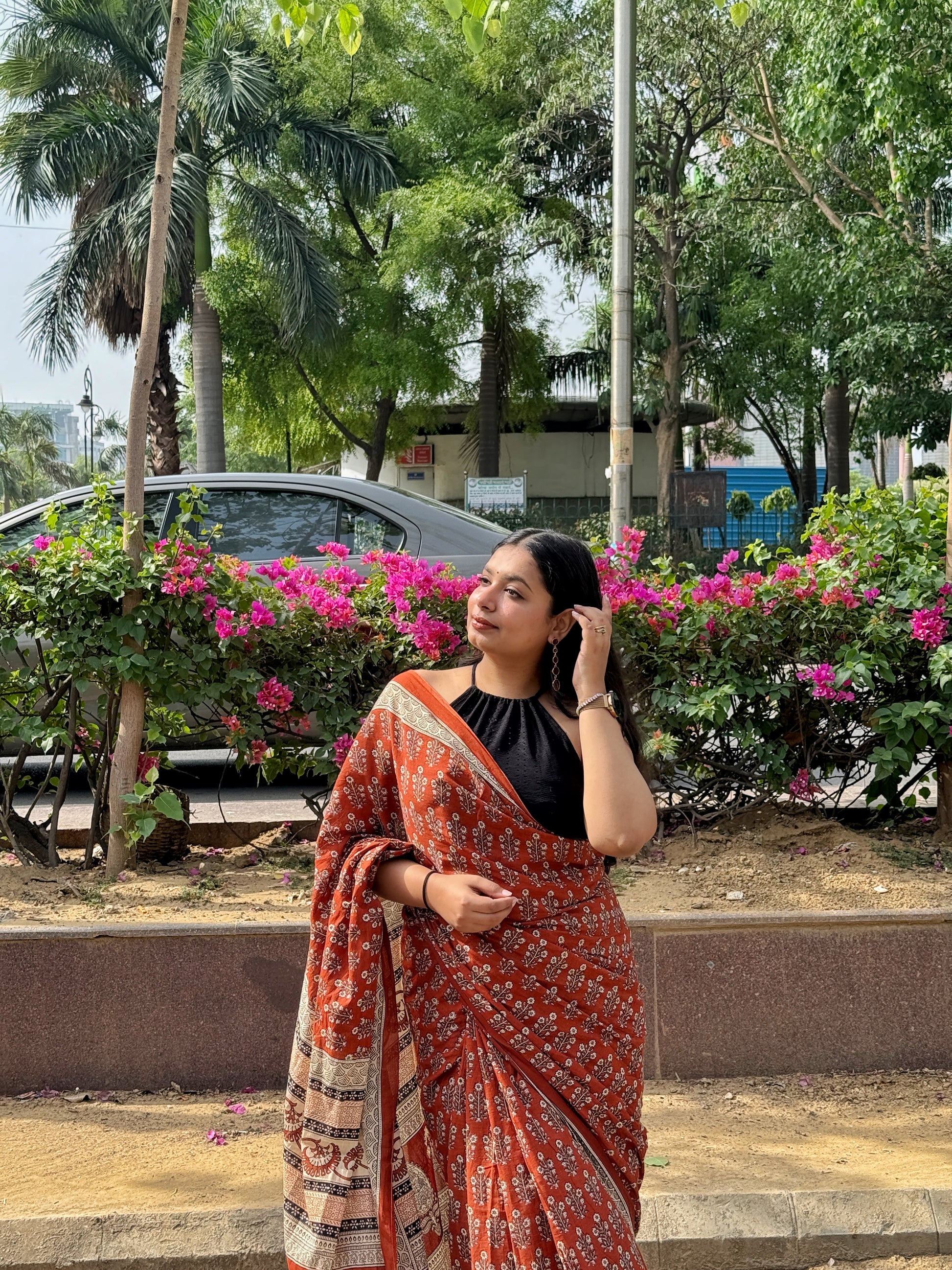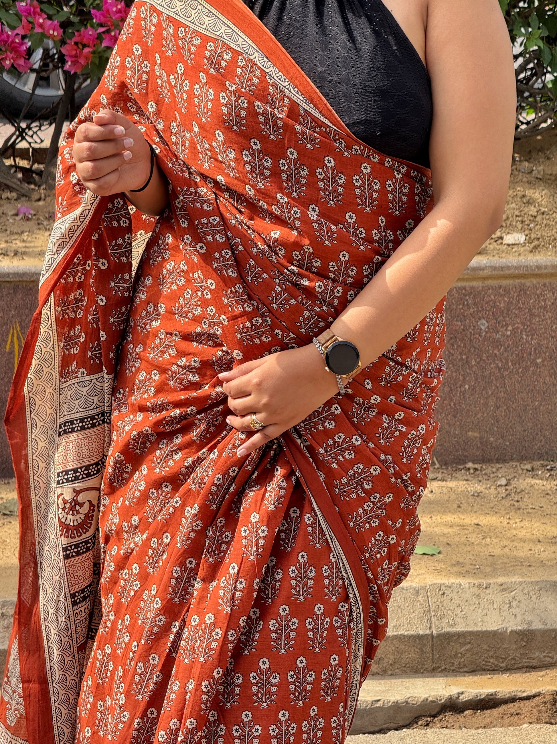 CRAFT: Printed cotton saree made using eco-friendly, Azo-free dyes. Handcrafted by skilled artisans using traditional block print techniques.