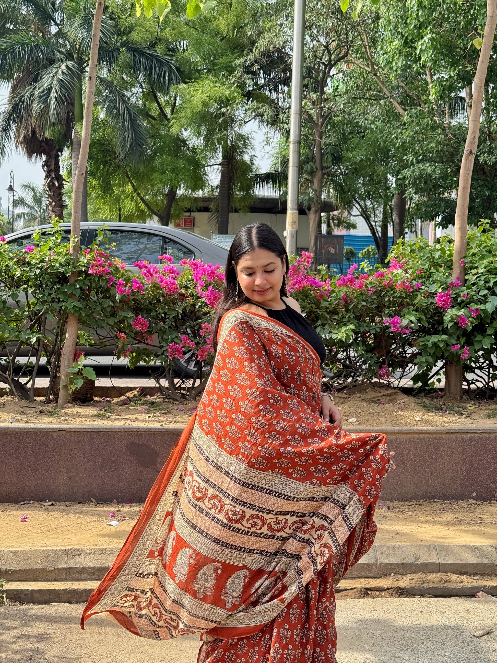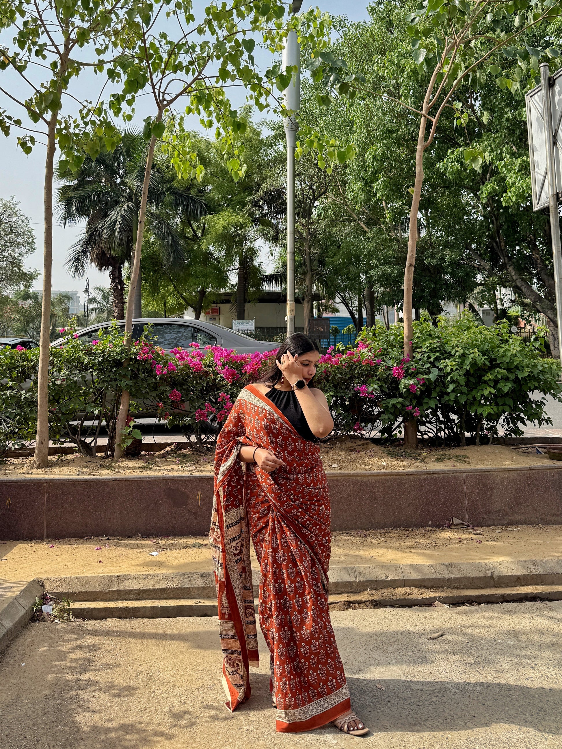 Dhaani – Brown Hand Block Printed Mulmul Cotton Saree