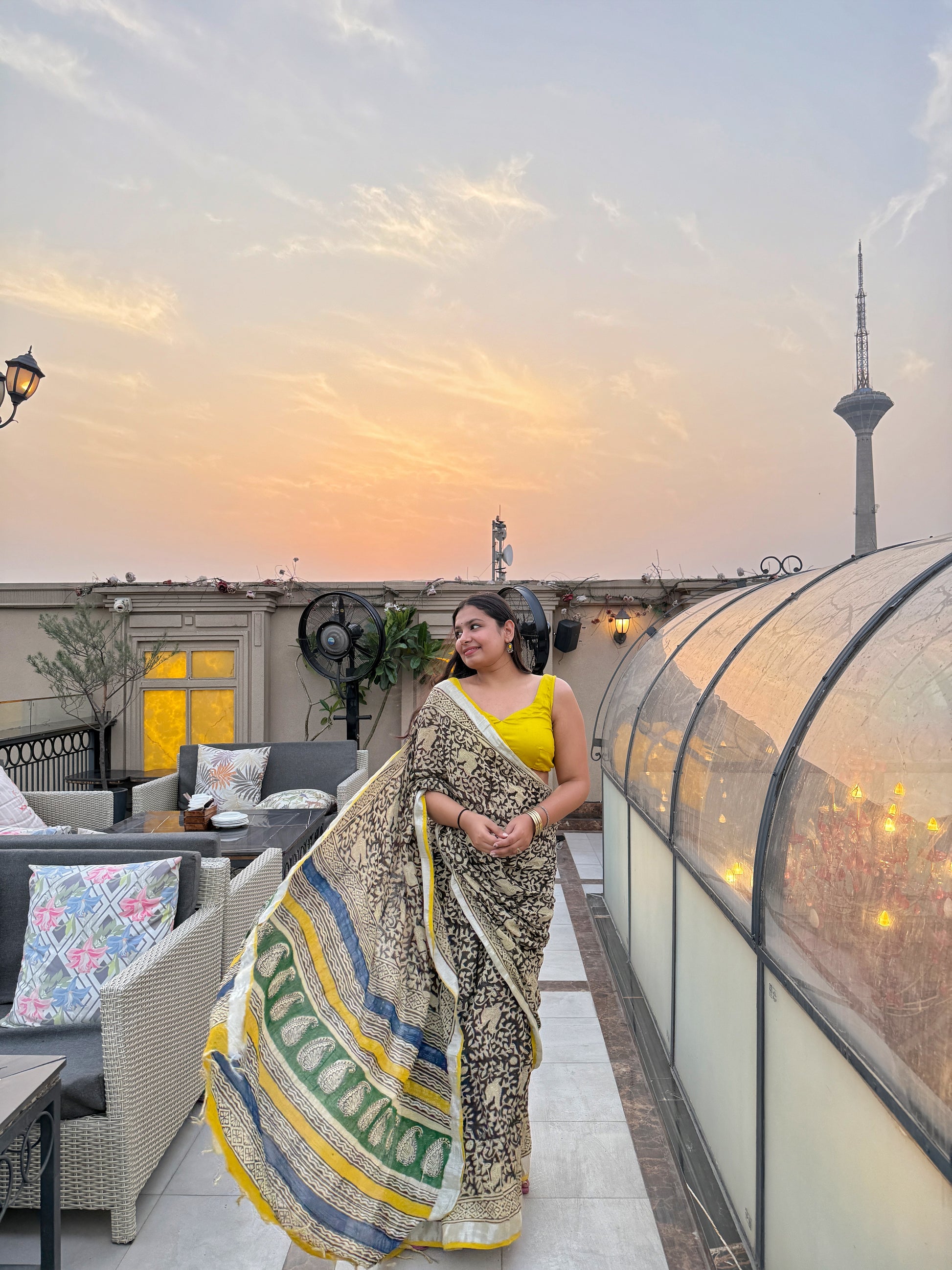 CRAFT: Printed cotton linen saree made using eco-friendly, Azo-free dyes. Handcrafted by skilled artisans using traditional block print techniques.